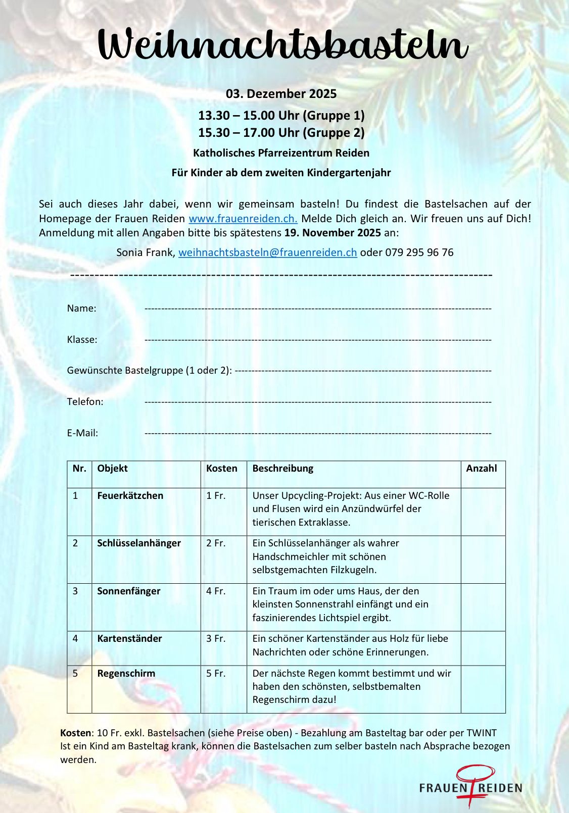 Anmeldungen werden von Sonia Frank via weihnachtsbasteln@frauenreiden.ch oder Tel. 079 295 96 76 bis spätestens